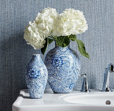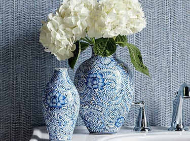 Baskets work beautifully with blue, as do simple arrangements of flowers in classic Chinese Ginger Jars or pottery vases.